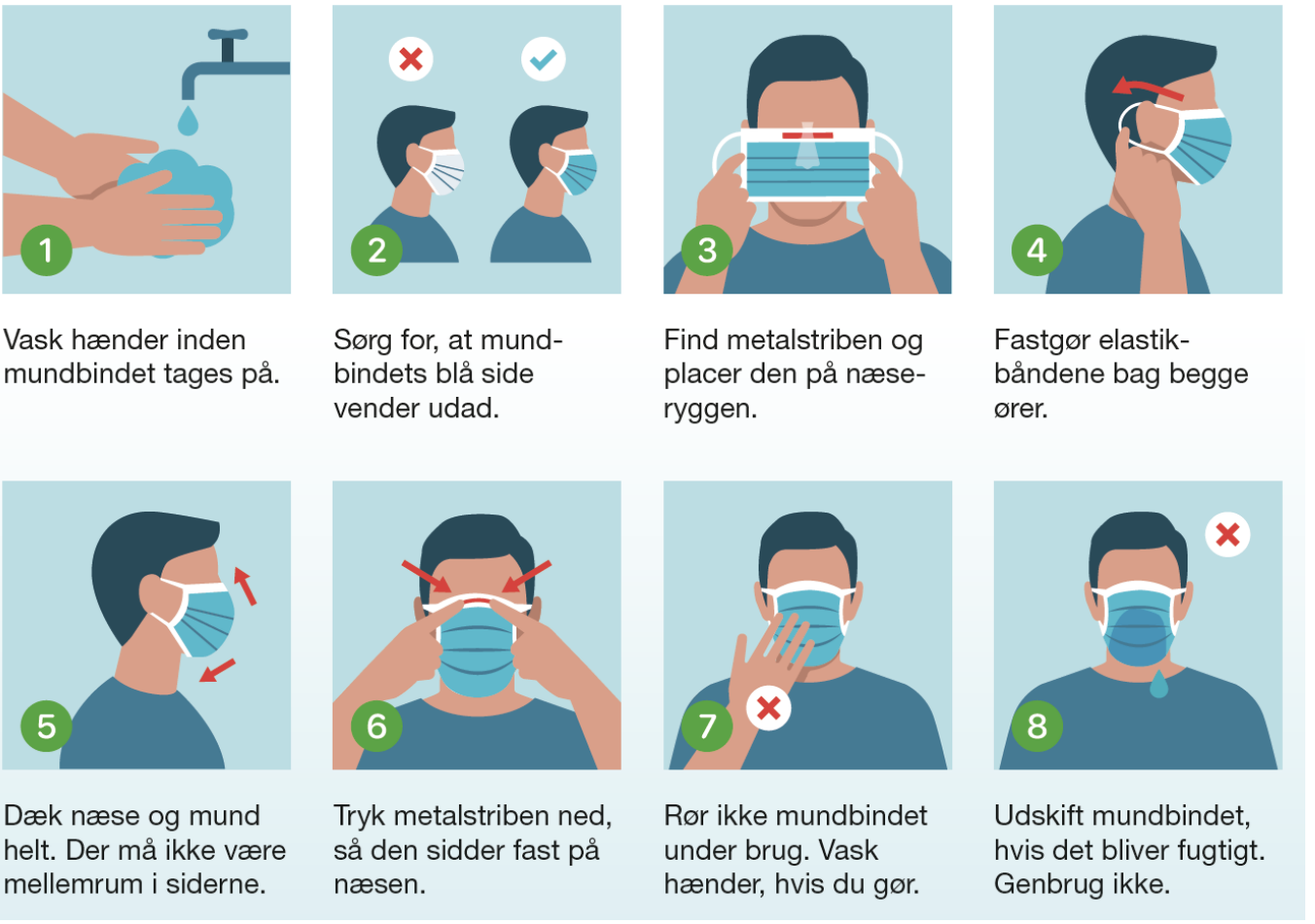 Vask og/eller afsprit dine hænder inden at mundbindet tages på. Form næseklemme og anbring masken på ansigtet, så det dækker mund og næse. Sæt elastikkerne rundt om ørene. Maskens blå side skal vende udad, og altid foldes helt ud.