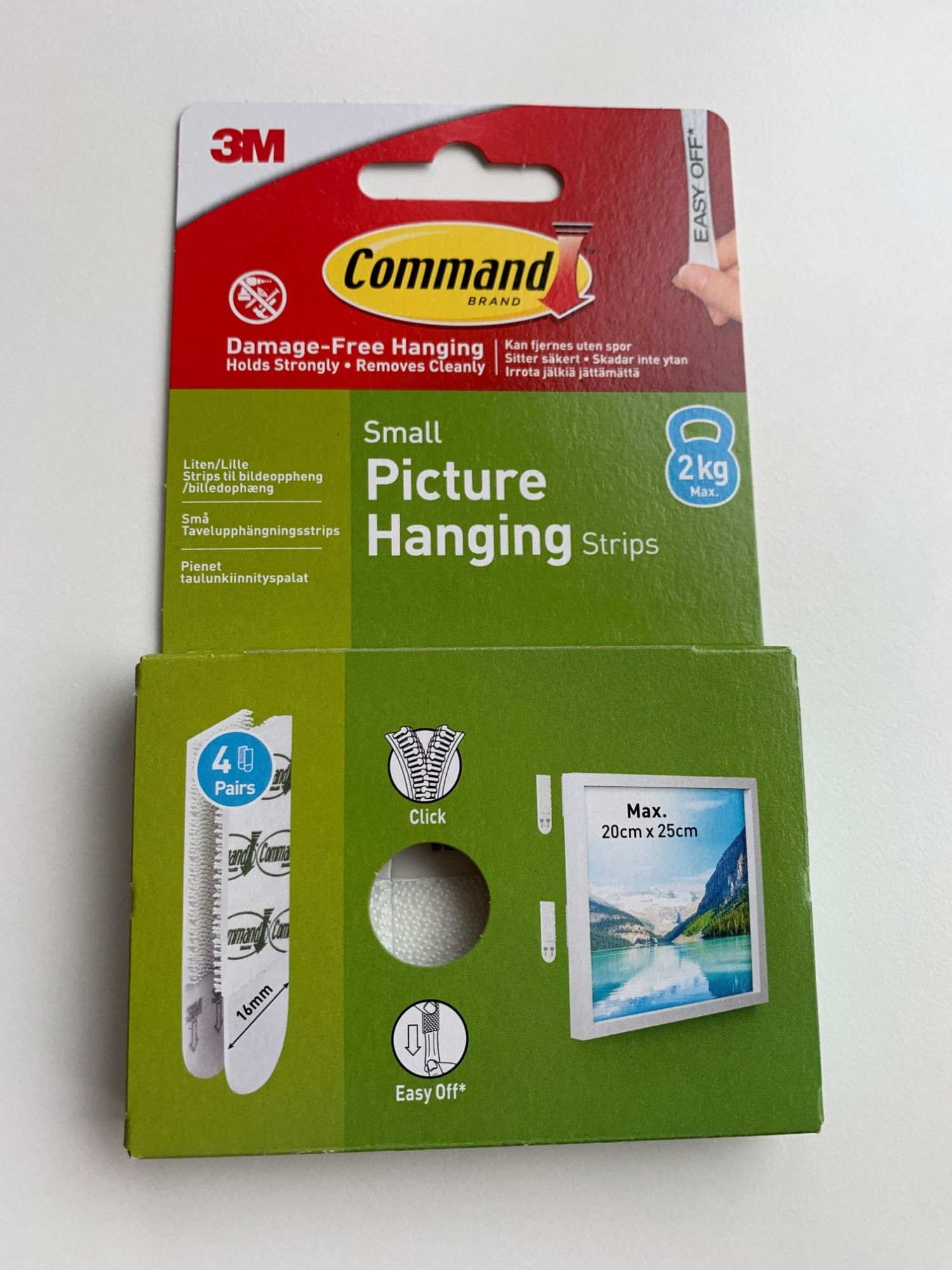 Hvide små strips fra 3M Command til billedophæng af mindre billedrammer. Stripsene kan bruges til nemt og effektivt at ophænge billedrammer i størrelser op til 20 x 25 cm.