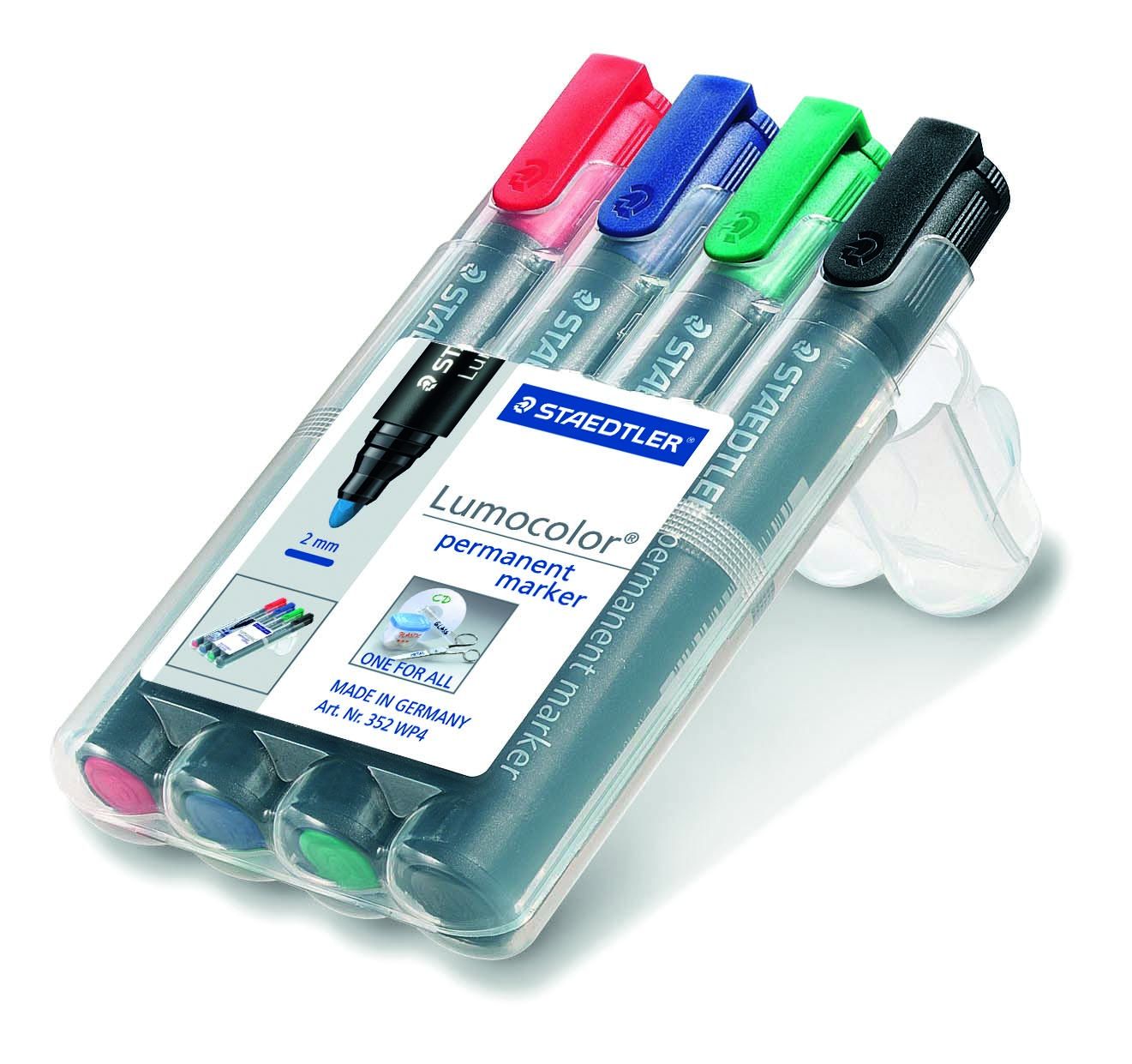 Permanent marker Lumocolor i høj kvalitet. Rund spids ca. 2mm. Smudsafvisende og vandfast og kan anvendes til mærkning og skrivning på stort set alle overflader så som metal, træ, plast, læder, karton. Tørrer på få sekunder, derfor ideel til venstrehåndede brugere. Farve intensiv lav lugt. lysægte. Sort og grøn farve er samtidig vejrbestandige. Stand-Up Staedtler Box. PP skaft og hætte sikrer lang levetid. Indeholder DRY SAFE blæk som gør den kan ligge uden hætte i dagevis uden at tørre ind. Genopfyldelige. Indeholder 4 assorterede farver. Made in Germany