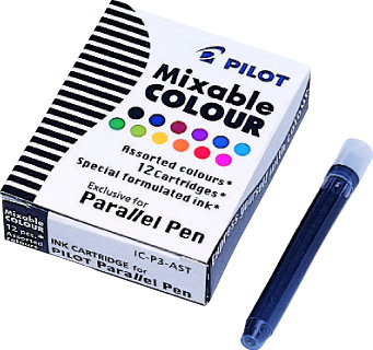 Patron til Pilot Parallel Pen. Husk at indsætte patronen lige. Passe på ikke at sno patronen. Hvis den ikke isættes korrekt er der risiko for, at pennen ikke fungere korrekt. Skrivefarve: assorteret farver. Pakket ·: 12 stk. i æske